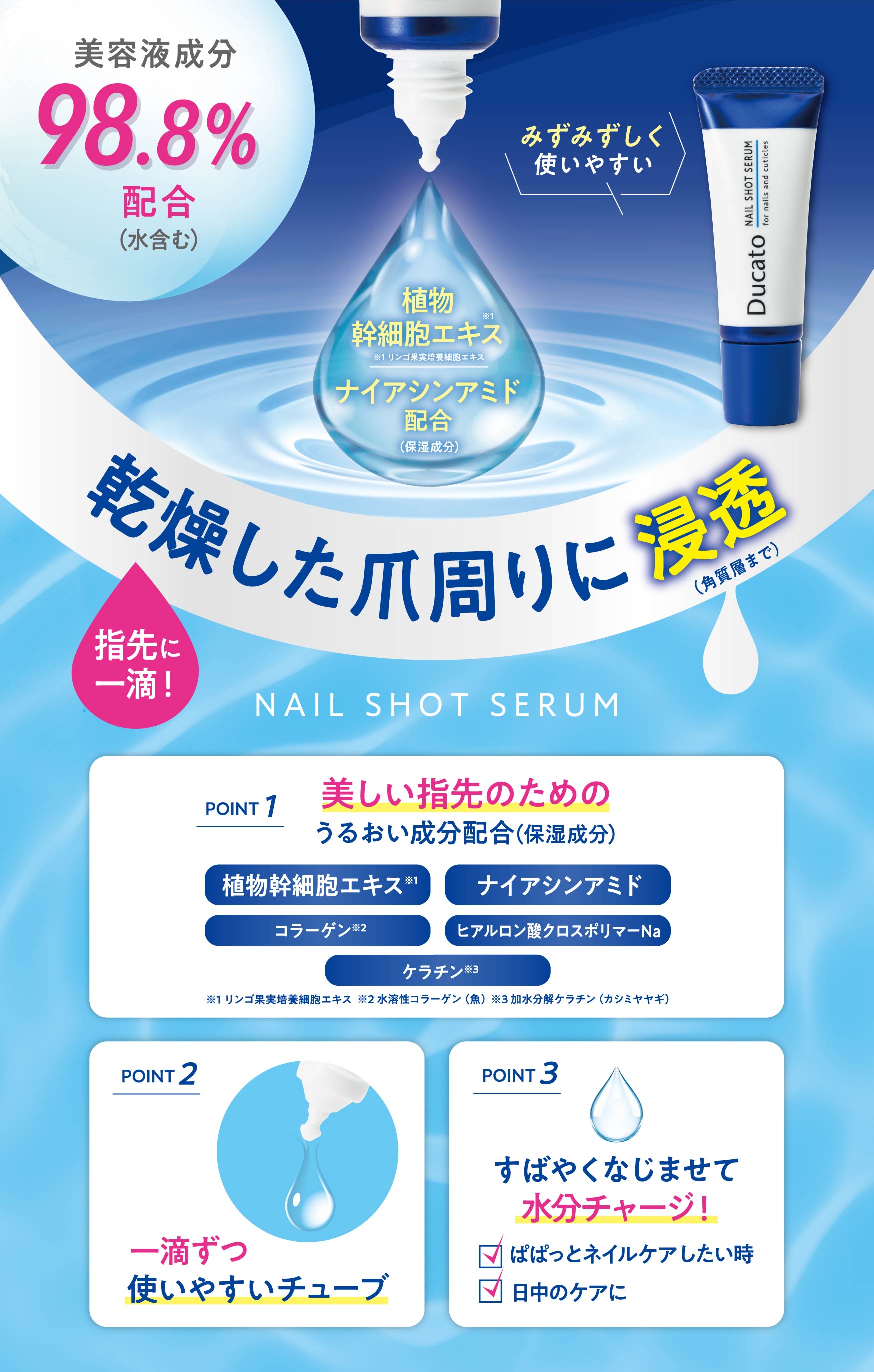 デュカートから、美容液成分98.8%配合(※水含む)みずみずしく、さらっとした使い心地の指先用保湿美容液「ネイルショットセラム」を発売いたします。