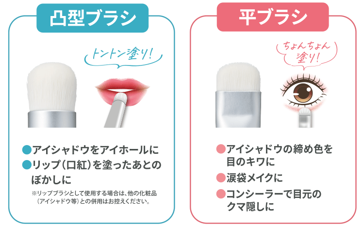 アイシャドウやリップをブラシに適量取り、ティッシュペーパーなどで量を調節してから、お肌にのせてください。※リップブラシとして使用する場合は、他の化粧品(アイシャドウ等)との併用はお控えください。